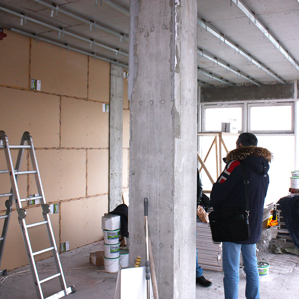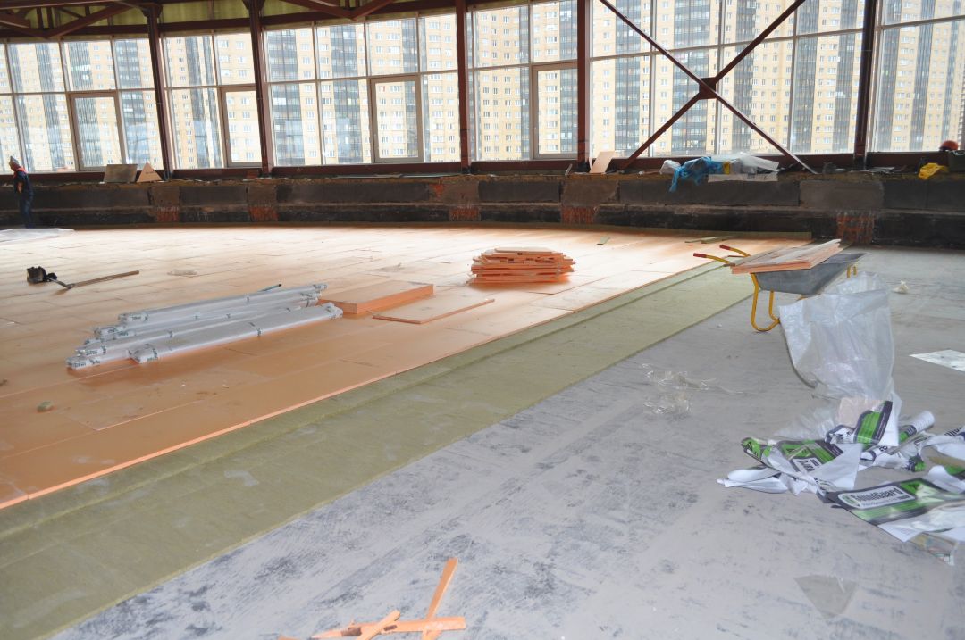 Фитнес клуб находится на втором этаже торгового и бизнес центра, поэтому в первую очередь была задача сделать звукоизоляцию пола.