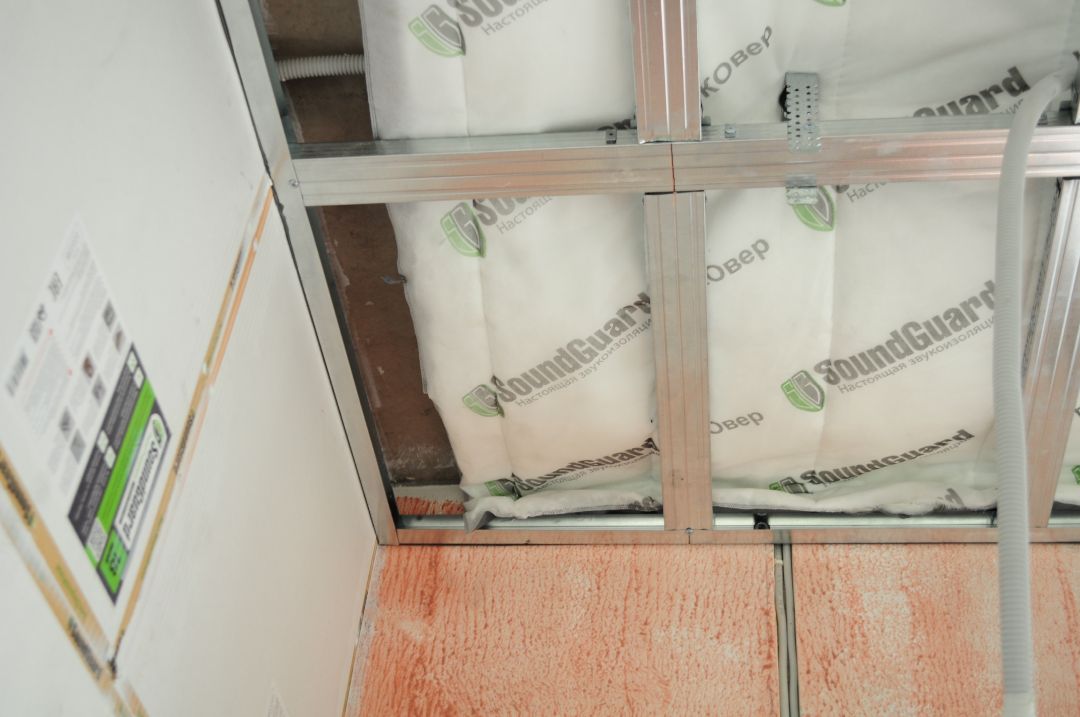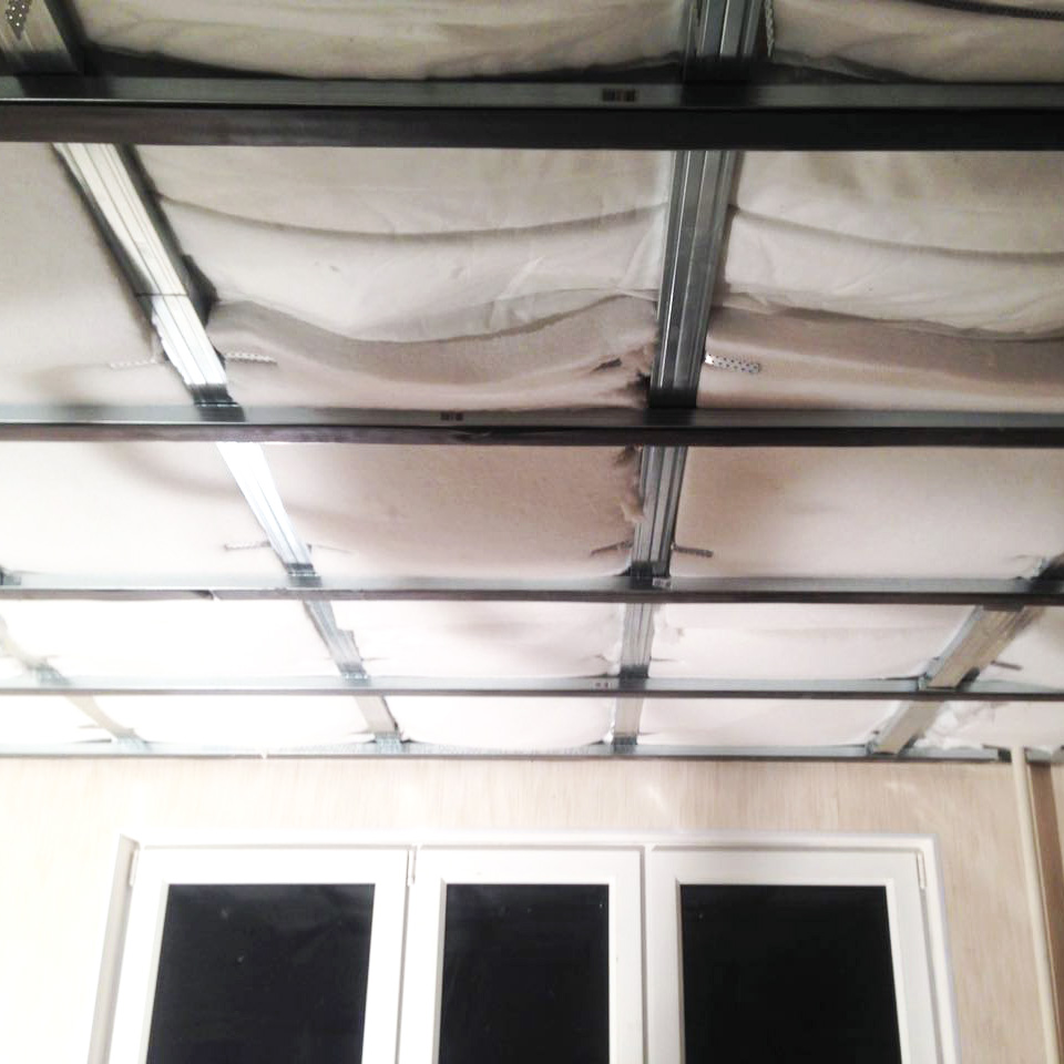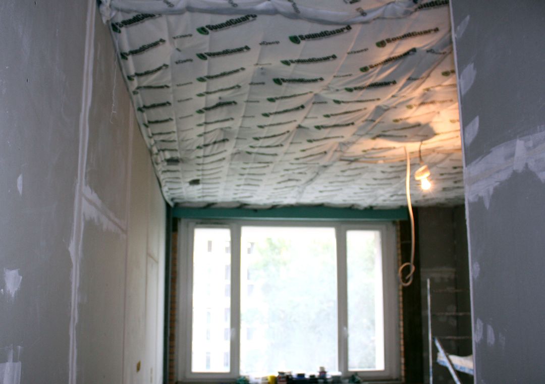 Временно снят натяжной потолок в комнате, смонтированная звукоизоляционная система "ОПТИМАЛЬНОЕ РЕШЕНИЕ" и снова установлен натяжной потолок.